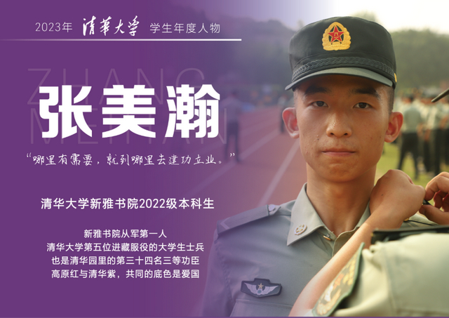 少年意气,携笔从戎。2021年3月,受加勒万河谷戍边英雄事迹感召,应征入伍进藏服役,成为清华大学第5位进藏服役的大学生士兵,也是新雅书院从军第一人。在雪域军营,他一手拿笔、一手擎枪,将知识力转化为战斗力,精研武器装备性能,以过硬军事技能荣立战备训练个人三等功。