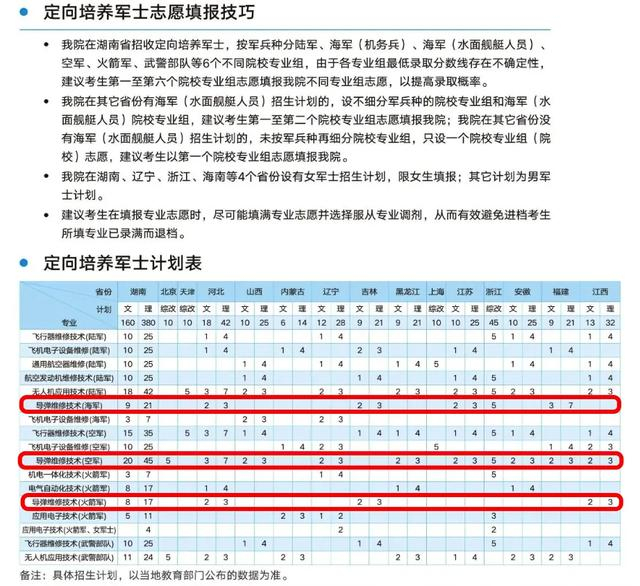 航空装备展示坪作为全国首批定向培养军士的定点院校,长沙航院在全国招收定向培养军士,按军兵种分6个不同院校专业组。导弹维修技术专业定向培养军士计划招收220人,普通招生计划招收40人。