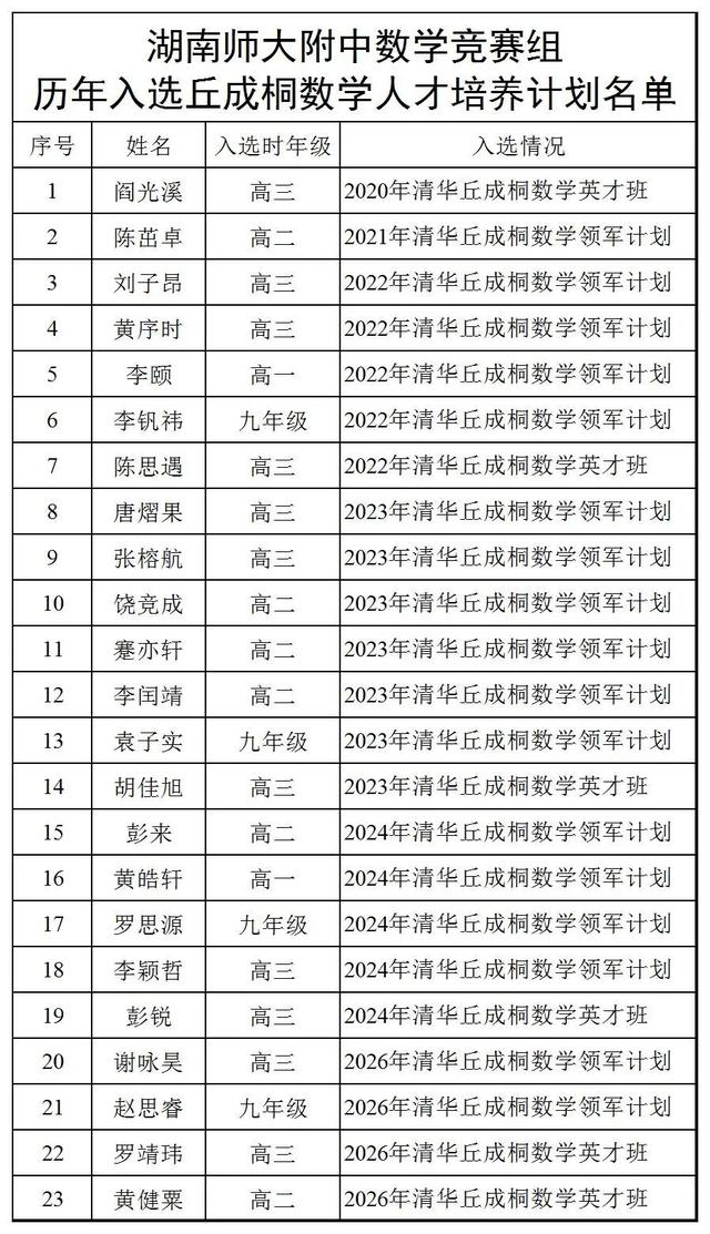 近日,清华大学2026年“数学英才班”入围结果揭晓,我校数学竞赛组罗靖玮、黄健粟同学通过初审、笔试、面试,成功入选,2人均获降特控线(一本线)录取清华大学的资格!自2020年我校阎光溪同学成为清华数学英才班首位湖南学生以来,我校已有23人通过丘成桐数学人才培养计划(17人丘成桐领军计划,6人丘成桐英才班),总人数全省第一!