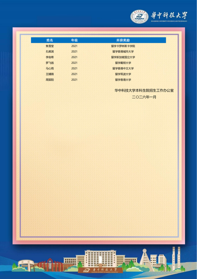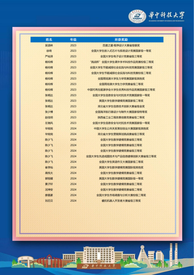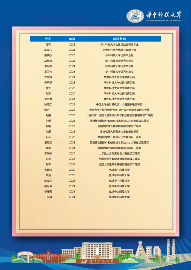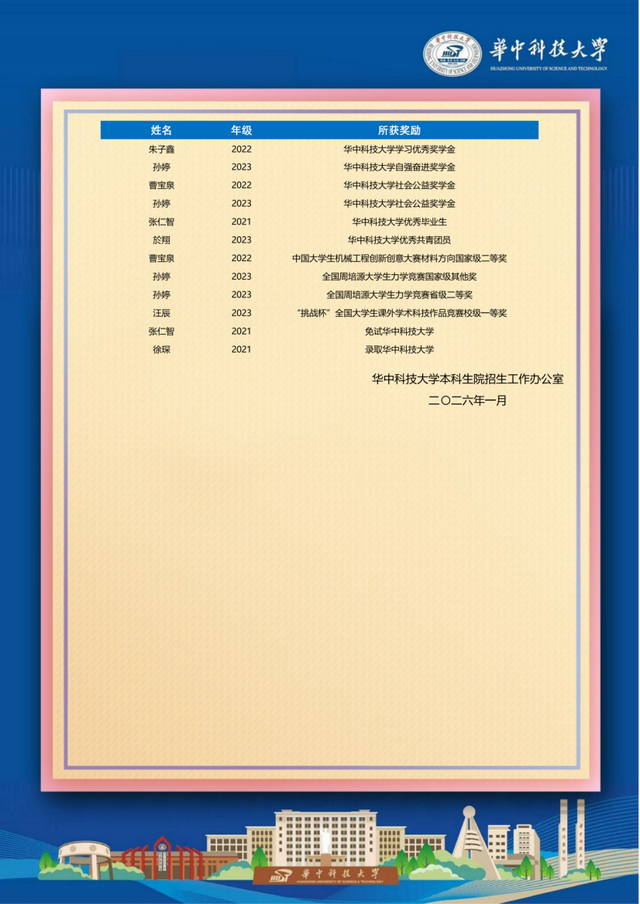 喜报显示,我校曹宝泉、秦嘉隆、孙婷、王真等毕业生在大学期间表现突出,多人荣获国家励志奖学金、华中科技大学科技创新奖学金,获评“华中科技大学三好学生”“华中科技大学优秀共青团员”等荣誉称号。