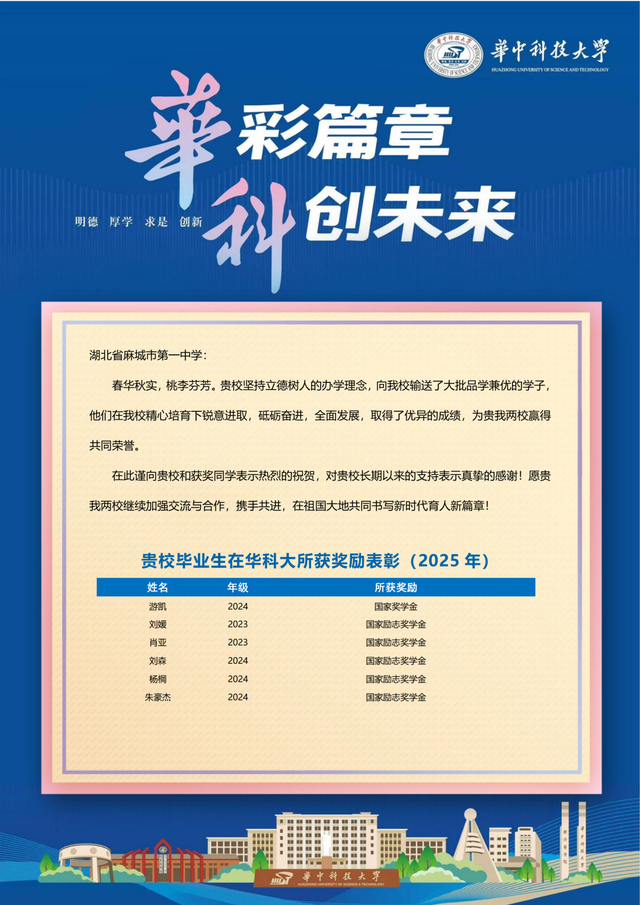 华中科技大学向麻城一中发来喜报