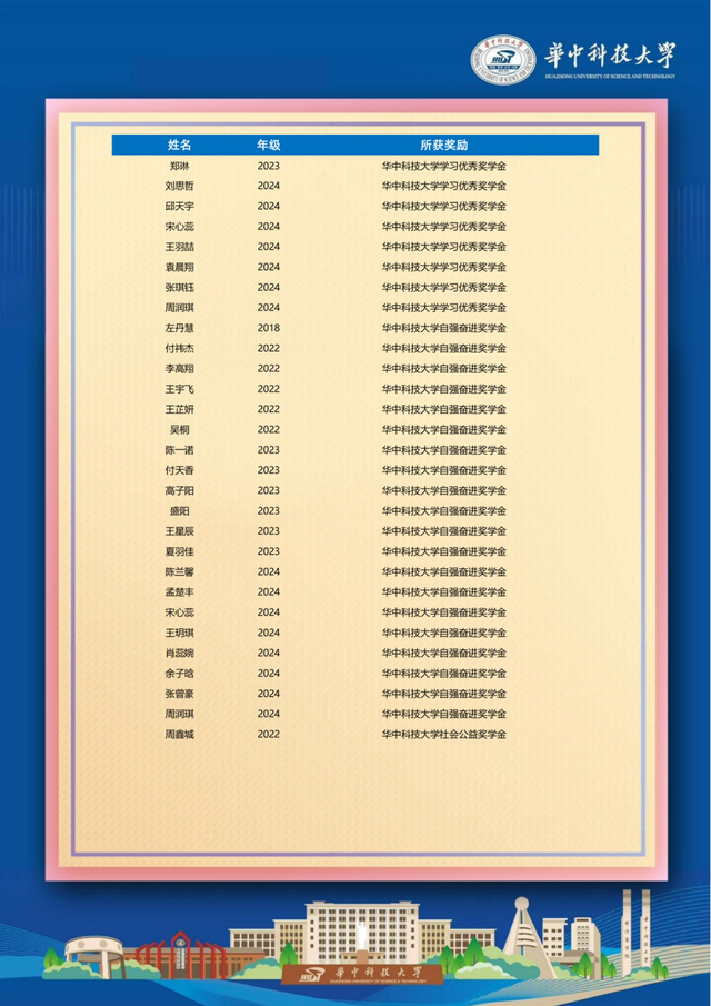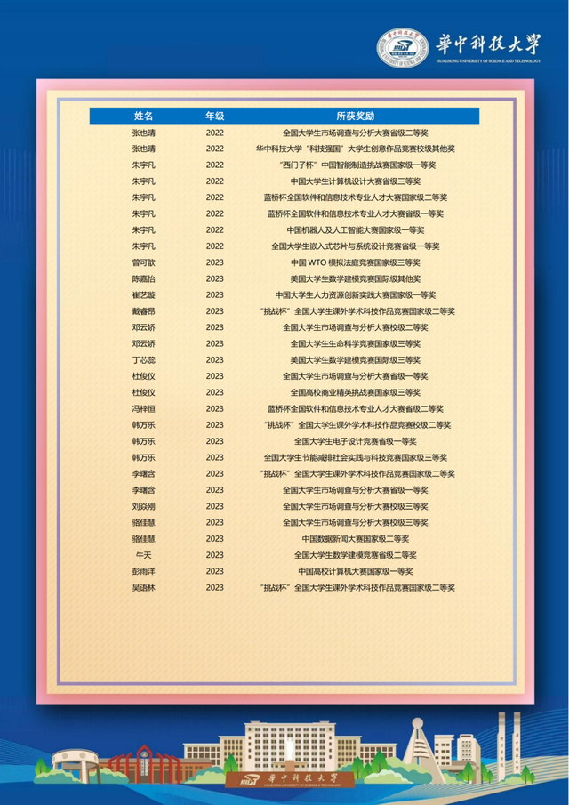 荣誉方面,龚怡诺、李曙含、张夏然、毕苏杭、黄鑫、周辉强6人斩获国家奖学金,9人获国家励志奖学金,3人获评华科本科特优生,近百名学子荣获“三好学生”“科技创新奖学金”等各类荣誉,300多人次获奖,全面发展特质凸显。