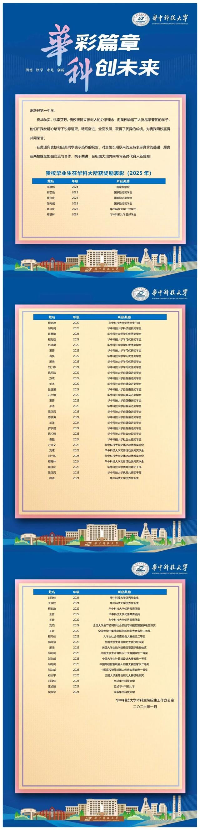 华中科技大学向阳新一中发来喜报