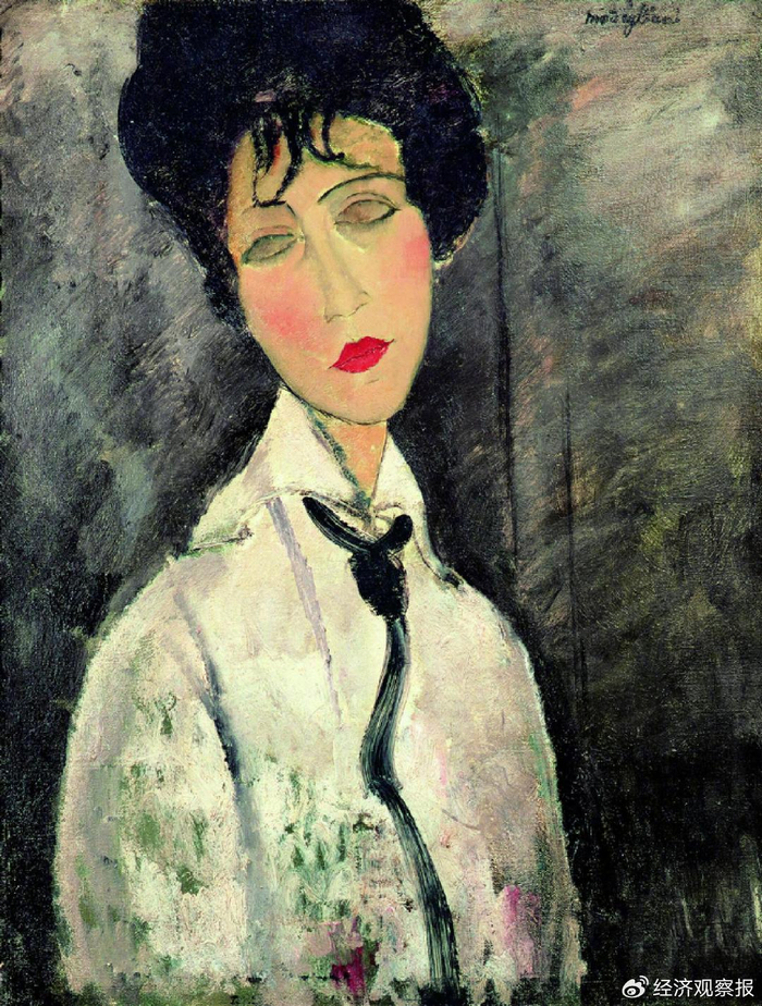 画中的女子被拉长的脸部和脖颈,展现出莫迪里阿尼独特的个人风格。女子忧郁的表情,透露出一种孤独的情感。而女子的浅红色眼珠若隐若现,仿佛注入了灵魂,闪烁着神秘的光芒。画中人物被平面化处理,富有很强的形式感。 整幅画作以黑色、白色和红色为主色调,营造出一种独特的氛围。黑色领带、白色衬衣和女子的浅红色眼珠形成了鲜明的对比,增强了画面的视觉冲击力。