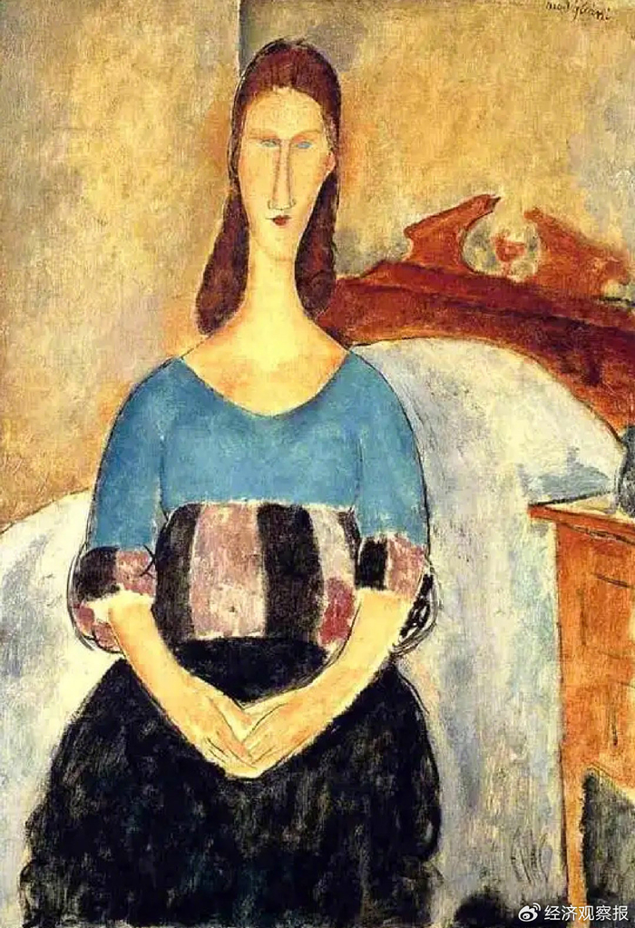 画中的人物形象被拉长,脸部特征被夸张,呈现出一种超现实的美感。这种风格不仅反映了莫迪里亚尼对艺术的独特理解,也体现了他对人物形象的深刻刻画画中的色彩运用简洁而富有张力,通常使用大面积平涂的色彩来表现肌肤,与背景颜色形成强烈对比,进一步突出了画中人物的形象。
