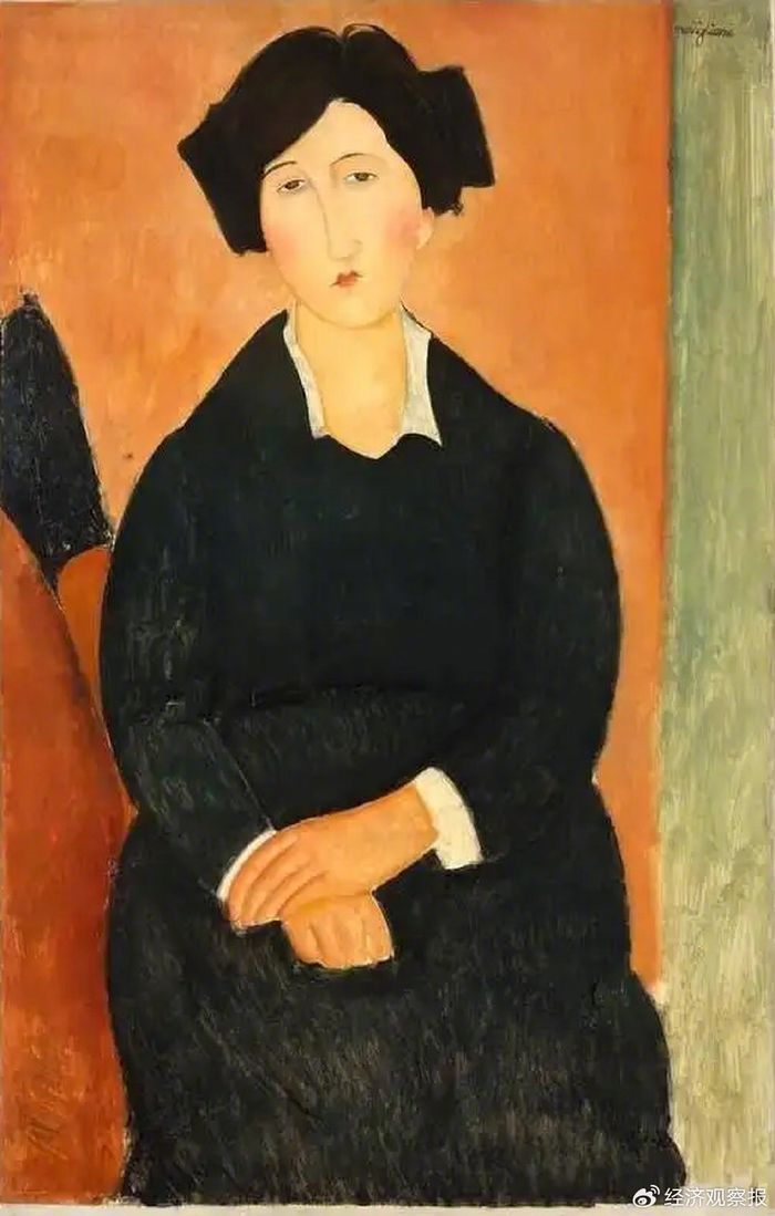 画中一位身着深色服饰的女子占据中心位置,她的姿态端庄而沉静,呈现出一种近乎雕塑般的稳定感。女子的头部被明显拉长,脸部轮廓呈鹅蛋形,鼻梁修长挺直,杏仁状的眼睛微微上挑,嘴唇轻抿,五官比例突破现实常理,却在变形中形成独特的韵律感。这种 “拉长” 并非随意为之,而是通过几何化的归纳(如将面部简化为弧线与直线的组合),赋予人物一种超越世俗的 “理想化” 特质。画面以棕褐、米黄、深灰为主色调,形成温暖而沉稳的基调。莫迪里亚尼摒弃了浓烈的色彩碰撞,转而通过微妙的色阶变化(如肤色中透露出的淡红与背景的暖灰)营造层次感。唯一的亮色来自领口与袖口的白边,如同一束光投射在暗色调中,既突出了人物的结构,又暗示了她内心可能隐藏的激情或哀愁。