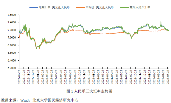2025年5月,人民币汇率震荡前行,总体在7.1722至7.2461区间内震荡上行。其中,人民币在岸汇率在7.1843至7.2461间波动;人民币中间价在7.1833至7.2095间波动;人民币离岸汇率则是在7.1722至7.2437间波动。国际方面,第一,中美经贸会谈,高关税问题得以缓解。5月10、11日,日内瓦中美经贸高层会谈取得实质性进展,中美间超高关税问题得以缓解,中美贸易得以修复的同时,美国与欧盟、日本、印度等国的关税谈判仍在进行当中。第二,穆迪下调美债评级。5月16日,国际信用评级机构穆迪宣布,将美国主权信用评级从Aaa下调至Aa1,将美国主权信用评级展望从“负面”调整为“稳定”。第三,日本长期国债收益率大幅上涨,引发市场对间接影响美债的担忧。5月20日,在日本国债拍卖会上,20年期国债投标倍数跌至2.5倍,远低于前月的2.96倍,尾差也从前月的0.34大幅升至1.14,为1987年以来最高值,受此影响,20、30、40年期日债收益率分别涨至2.53、3.15、3.62。与此同时,10年期美债收益率涨至4.48,美元指数也从19日的100.3726降至20日的100.0219。第四,全球降息潮。5月8日,英国央行宣布,将基准利率下调25个基点,从4.5%降至4.25%;5月29日,韩国央行宣布降息25个基点,将利率从2.75%下调至2.5%,是韩国2024年10月以来7个月内的第四次降息。