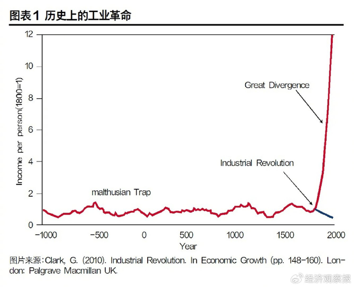 抛开中西之分,从全球来看,在过去几千年里,世界经济曾长期处于“马尔萨斯陷阱”所描述的低人均收入水平状态,这一情况直到第一次工业革命(1800年前后)才迎来转折。少数国家的人均收入开始飙升,并逐步带动了全球经济的腾飞,打破了持续到工业革命以前的“超稳定”状态。第一次工业革命将人类发展带入了一个崭新时代:经济发展迅猛,科技进步日新月异,社会变革的步伐不断加速,历史性的转折点和关键拐点不断涌现。