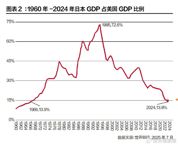 美国知名学者傅高义(EzraF.Vogel)在1979年发表的著作《日本第一:对美国的启示》中,分析和肯定了日本在多方面的成功。但十年之后,日本的经济奇迹消逝,进入了长久的衰退和停滞不前。2024年日本的GDP只有美国的13.8%。