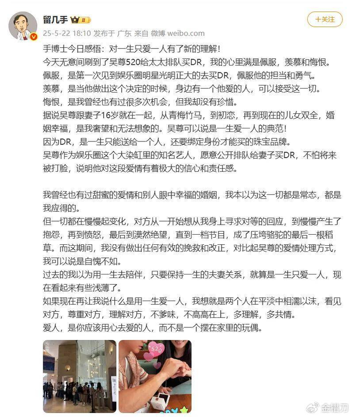 消息很快收获全网瞩目,一向毒舌的娱乐圈记者卓伟直接称呼吴尊是“用一生爱一人”的典范,因婚姻纠纷频上热搜的网红留几手也直言自己“不如吴尊”,羡慕吴尊。