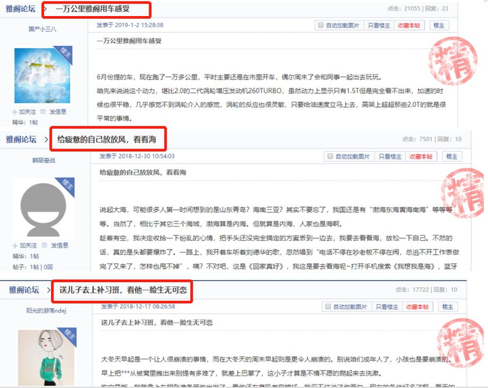 同一辆车有三个不同的故事,被编进了《给疲惫的自己放放风,看看海》、《一万公里雅阁用车感受》以及《送儿子去上补习班》三篇文章里,再由三个不同的ID发出来,加精置顶。