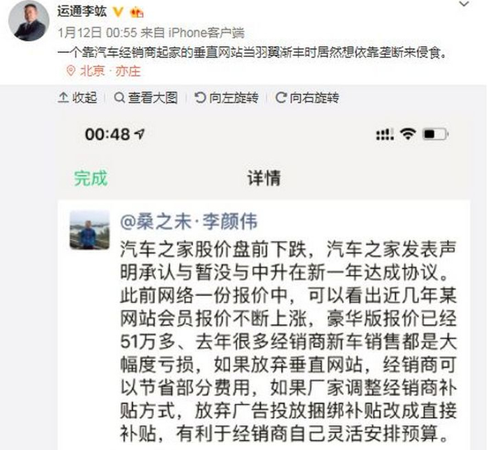 运通汽车集团总裁李竑直接叫板汽车之家:“一个靠汽车经销商起家的垂直网站当羽翼渐丰时,居然想依靠垄断来侵食。”