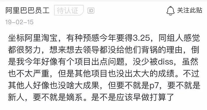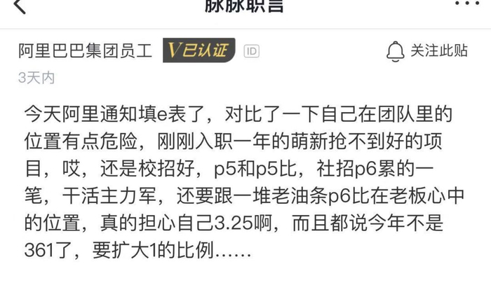 阿里文化,“今天最好的表现,是明天的最低要求”。阿里一向实行361考核制度,每年考核都有固定10%的人被打低绩效(3.25),一旦背上3.25,离被淘汰也就不远了。