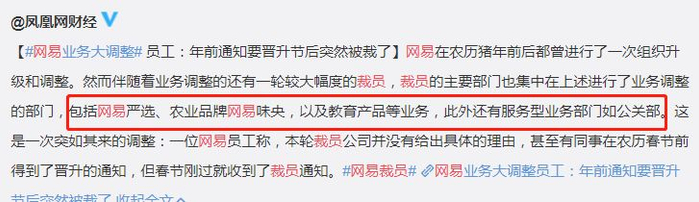 裁员的主要部门也集中在上述进行了业务调整的部门,包括网易严选、农业品牌网易味央,以及教育产品等业务,此外还有服务型业务部门如公关部。