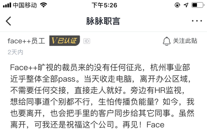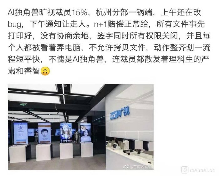 记录中提到的face++杭州分部,脉脉上找到如下相关信息,真假自行判断。n+1正常赔偿, 当天走人。