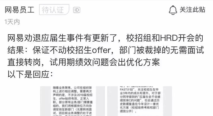 这次优化,同样给19年校招新同学带来了灾难,尚未入职,部门没了,即使调岗,也未必有对口的。脉脉上有俱多讨论帖,也有疑似hr或校招部门的回应,而员工似乎不买账。
