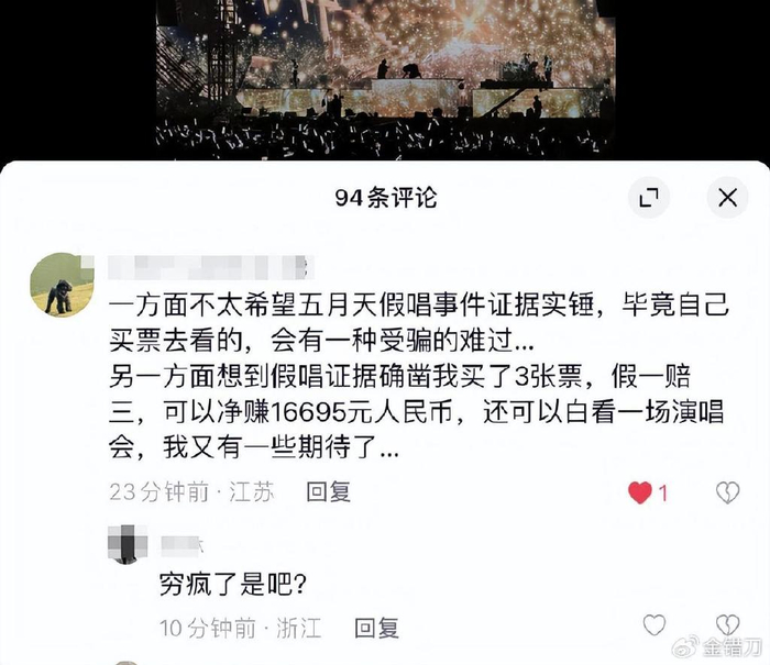 有的歌迷也很纠结,一方面痛心五月天假唱,一方面又希望假唱实锤,自己能“假一赔三”,还能意外理财。