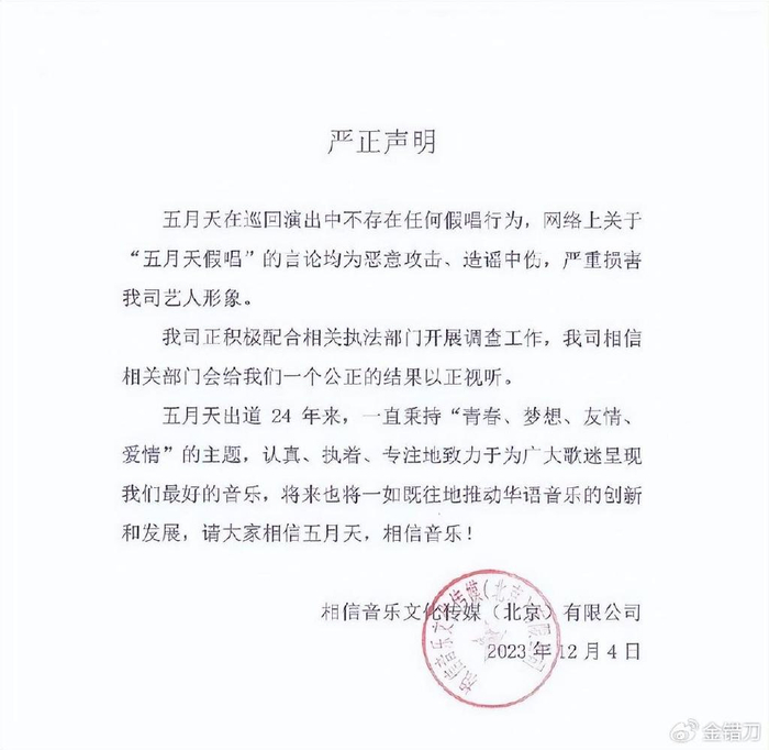 五月天官方并没有承认假唱,他们先是发布了巴黎专场“全程直播”的新闻,又在昨晚发了一则法律声明,声称乐队绝对没有假唱。