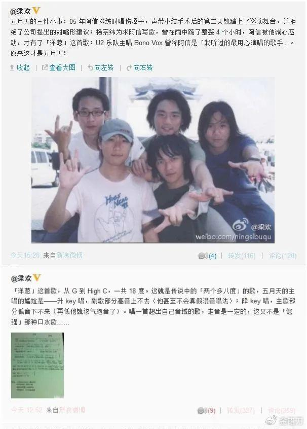 音乐人梁欢曾经就因为陈信宏的“唱功”问题,在微博上疯狂阴阳怪气,还和五月天的歌迷们产生了一场旷日持久的微博骂战。