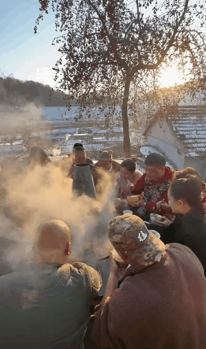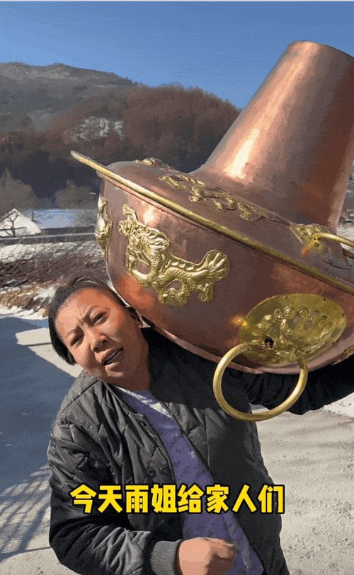 远方是被白雪覆盖的村庄,镜头前是雨姐扛来十几斤的大铜锅,朋友围坐在一起,天气是冷的,心却是热的。