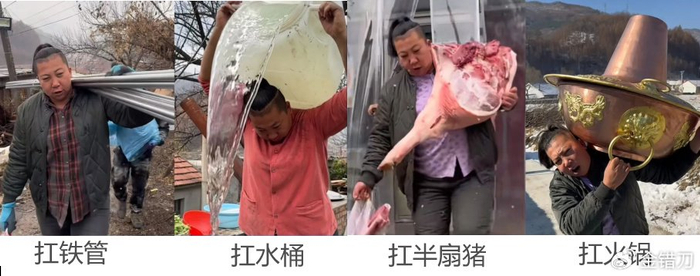 即单手扛铁管、肩上扛水桶、单手扛半扇猪、雪地扛铜锅。