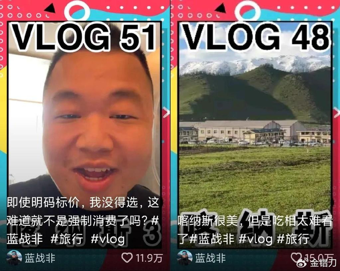今年开始,随着蓝战非的环球旅行越来越火,同样的句式被改头换面用在了蓝战非身上:游戏直播从没看过,旅游视频期期不落。