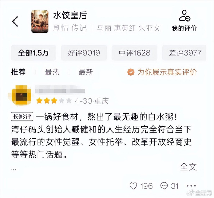 不过,虽然《水饺皇后》成功登顶五一档第一,口碑却是极度两极分化。