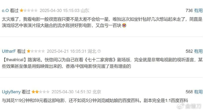 但有人评价:“与其花119分钟和59元看这部电影,还不如花5分钟浏览臧姑娘的百度百科。剧本完全是1:1百度百科。”