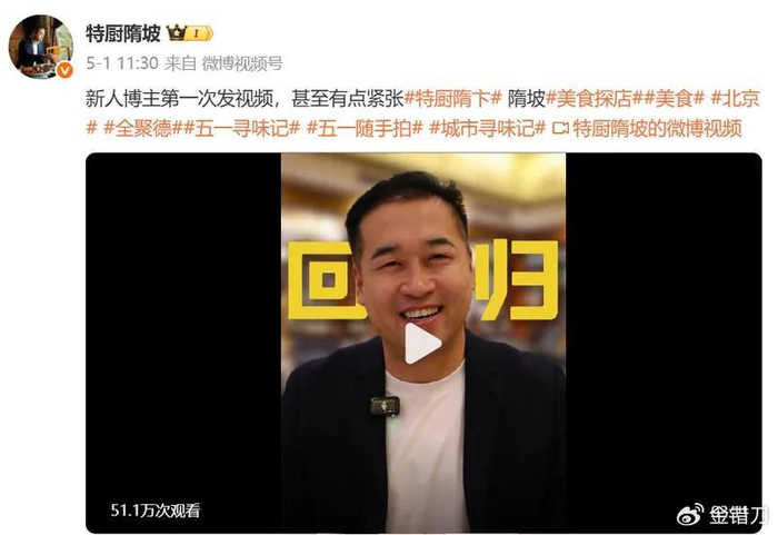 然而,吃饭没有隋坡的日子刚过去几个月,人们发现隋坡又以“特厨隋坡”的网名重新复出,同样的节奏、同样的探店,一条视频就涨粉数十万。