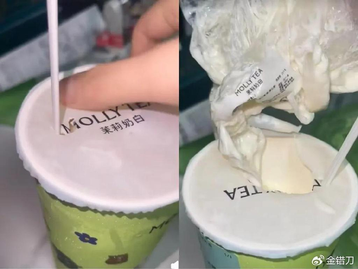 在今年3月份,上海的一位消费者在喝茉莉奶白时就在杯子里喝出一个塑料袋。