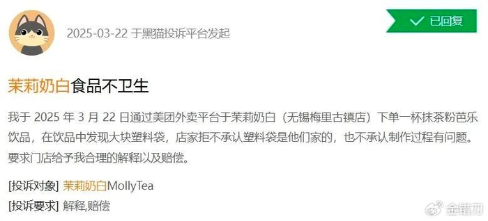 在黑猫平台上,针对茉莉奶白的投诉就多达三百多条,其中不乏对售后、产品质量等多方位的投诉。