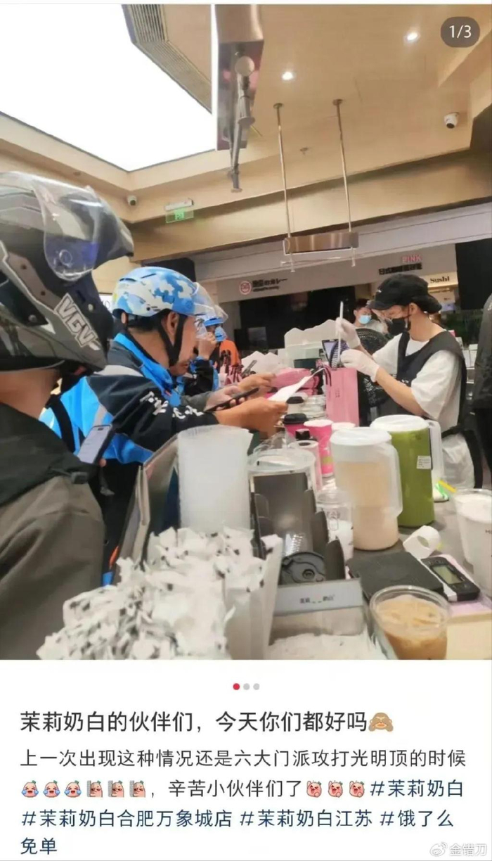 茉莉奶白还赶上了最近的外卖大战,新开的小店没被排队打卡的人挤爆,也被外卖小哥堵得水泄不通。