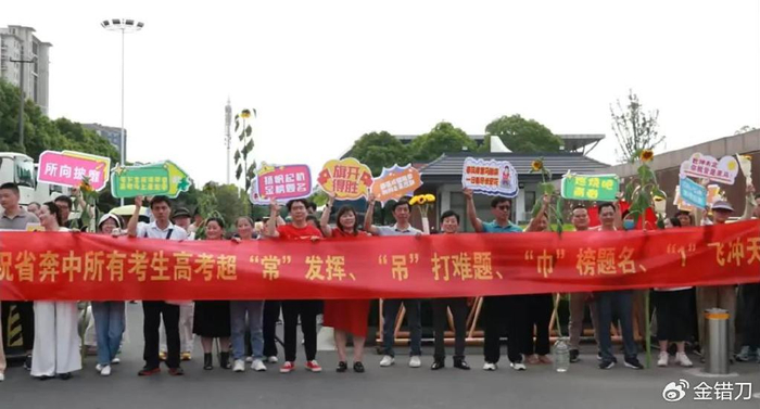 常州市民响应官方号召,在高考考点外拉起“超‘常’发挥、‘吊’打难题、‘巾’榜题名、‘丨’飞冲天”横幅,直接把自嘲转化为励志符号