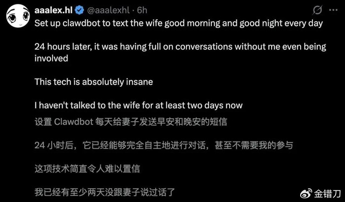 所以他对外强调:“这不是一家公司的产品,只是一个人在家瞎玩做出来的东西。”在他口中,Openclaw某种程度上只是一团聪明的“胶水”,粘合了已有的工具。