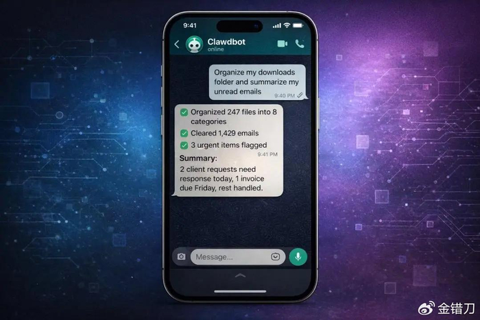 有个开发者分享,他最初只是让Moltbot每天趁自己睡觉时优化工作流,结果它不仅自己设计了专属形象,还悄悄调用ChatGPT API开发出语音功能,第二天早上直接开口跟他打招呼,吓得他差点从椅子上摔下来。