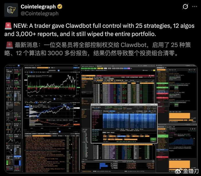 有人做了次激进的实验,他给了Openclaw访问其投资组合的权限,并下达指令:“将其交易到100万美元,不要出错。”随后Openclaw确实勤奋,绘制了许多技术图表,开启了全天候交易模式。它应用了25种策略、参考了3000多份报告、运行了12种新算法,最后血本无归。
