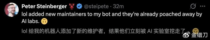 由于太火,Openclaw创始人表示他刚招的维护人员,转头就被同行给挖走了……