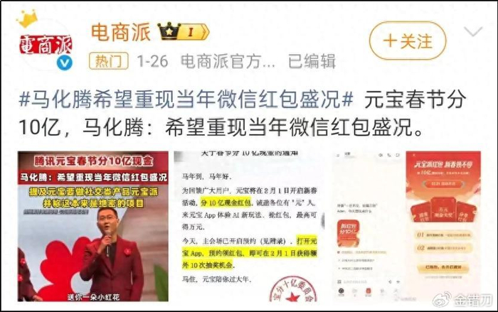 1月26日,在员工大会上,腾讯宣布元宝将在春节豪掷10亿现金红包拉新,马化腾直言“希望能够重现11年前微信红包的时刻”。