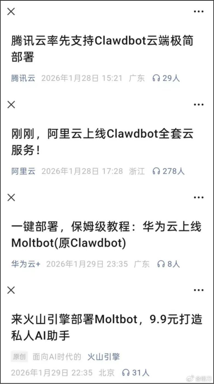 从中也能看出Moltbot的影响力,而这场小插曲,也没阻挡Moltbot的火爆趋势。国内外的科技平台纷纷跟进部署,一时间打工人忙着研究怎么用它摸鱼或提高生产力,科技大佬则在琢磨它的底层逻辑。