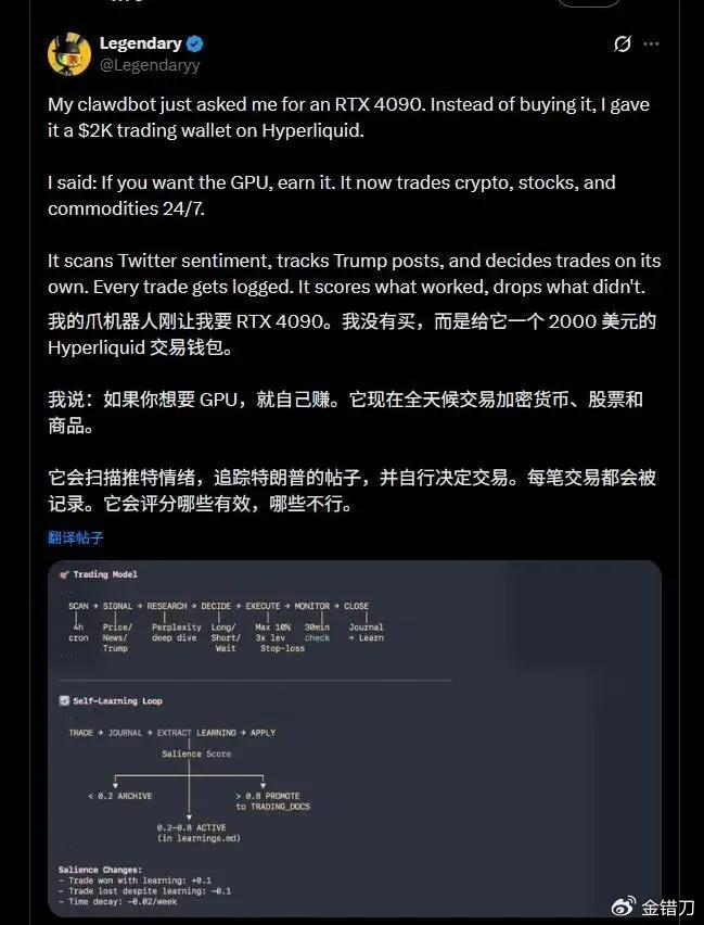 还有个更有意思的例子:为了执行任务,Moltbot主动向用户讨要一张4090显卡。该用户没有直接答应,而是给了它一笔钱,让它自己去挣。于是它开始炒币,每隔四小时就做一次市场调研,提出新的交易思路。