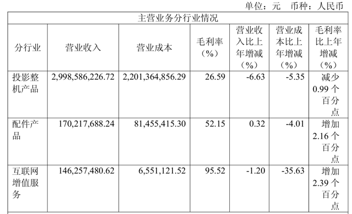 财报显示,2024年全年,公司主营业务分行业销售营收构成主要以投影整机为主,投影整机产品实现收入29.99亿元,占公司全年营收份额88.07%。不过本年度,该产品毛利较上一年度减少0.99%,营业收入同比下滑6.63%。