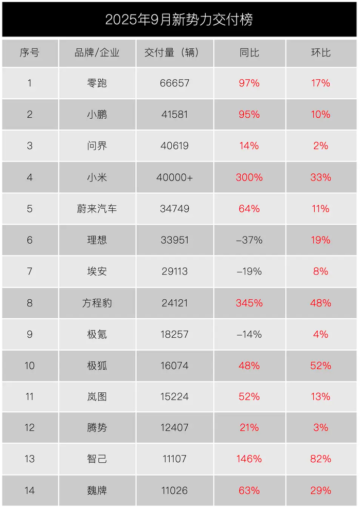 小米汽车单月交付首次超过4万台,相比8月的超3万台,环比增长超过33%,这个销量让小米在新势力排名中超越了理想汽车,跻身前四。