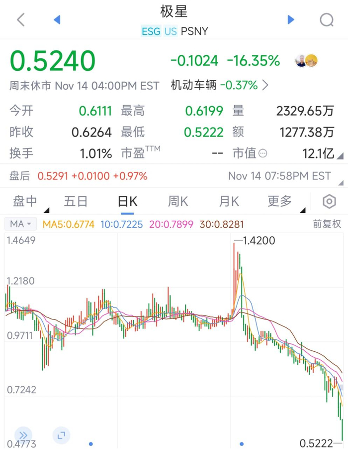 回望极星汽车的上市历程,2022年6月24日,极星首次登陆纳斯达克。仅仅三年半时间,极星汽车的股价已经从13美元跌至约0.5美元,累计跌幅达94.4%。