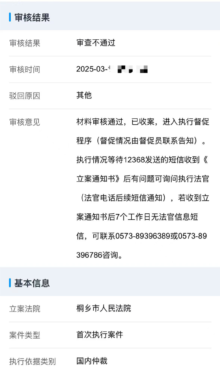 李海对「甲子光年」说:“因为早就过了60个工作日的约定汇款时间,所以我们现在申请的是强制执行,是向桐乡市法院提起的立案,但是他们不受理。”