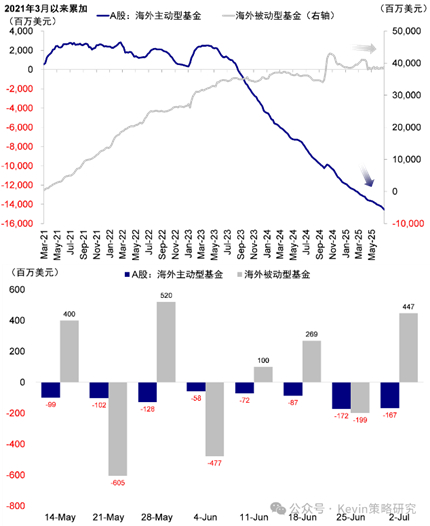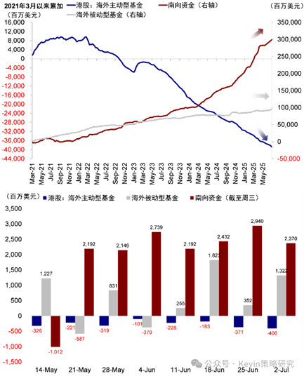 本周EPFR跟踪的主动外资继续流出,被动转为流入,六月最后一周来看,主动外资继续流出,流出A股1.7亿美元,流出规模与上周基本持平;流出港股和ADR 4.1亿美元(vs. 上周流出3.7亿美元);流出较多的为专注中国和全球新兴市场等类型基金。被动外资转为流入,A股流入4.5亿美元(vs. 上周流出2.0亿美元);港股和ADR大幅流入13.2亿美元(vs. 上周流入3.5亿美元),流入主要是专注中国与新兴市场的基金。南向方面,本周南向资金流入138.9亿港元(vs. 上周流入283.8亿港元),日均流入34.7亿港元(vs. 上周日均流入56.8亿港元),全年南向资金已累计流入7,398.7亿港元。个股层面,上周增持最多为中芯国际、美团与信达生物等,但流出阿里、腾讯与小米等。