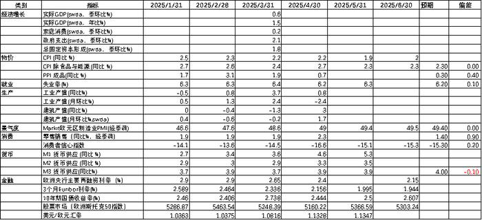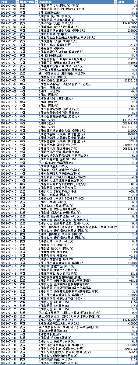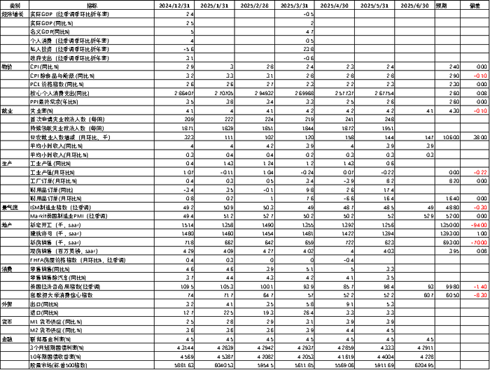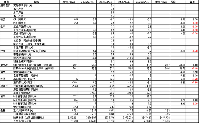 6月以来,美国陆续和各地达成关税协议,美国经济出现一定情况的好转。通胀方面,美国4月CPI为2.4%,PCE2.3%,均符合市场预期。美国就业市场表现仍强,6月非农就业人数增长14.7万人,超出市场预期,失业率保持在4.1%相对低位,联储降息预期进一步延后。工业生产方面,美国工业产值月同比增长0.6%,ISM制造业PMI为49,仍在荣枯线以下,耐用品订单收到抢进口影响,同比增长17.4%。消费方面,社零同比上升3.3%,密歇根大学消费者信心指数回升到60.7,美国经济仍仍在软着陆过程中。