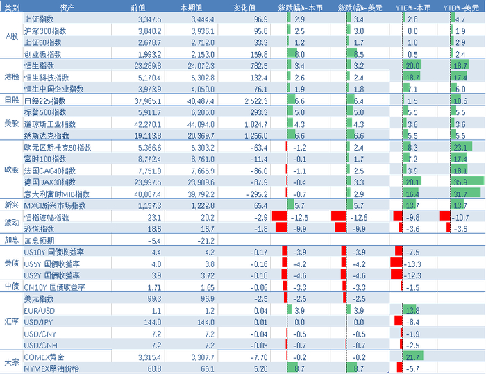 -股市:全球股市上涨,市场波动率有所下降。A股沪深300指数上涨2.5%,上证指数上涨1.2%;港股恒指上涨3.4%,恒生科技上涨2.6%,恒生国企上涨1.9%;美股标普500上涨5.0%,道指上涨4.3%,纳指上涨6.6%,美股波动性大幅下降,VIX指数下降12.5%;欧股下跌,欧元区斯托克50指数下跌1.2%,日股日经225指数上涨6.6%;新兴市场指数上涨5.7%。