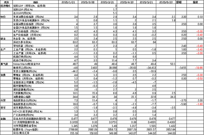 日本经济持续弱复苏。工业生产方面,5月份日本工业产值同比-1.8%,同比转为下滑。Markit制造业PMI降至50.1,有所恢复但仍在荣枯线以下。消费方面,社零数据同比增长2.2%,符合市场预期。外贸方面出口同比增速-1.7%,同比增速回落,进口同比-5.9%,也有所回落。物价方面,5月份东京CPI为3.1%,进一步抬升,日本再通胀初见端倪。日本央行1月无担保隔夜拆解利率维持稳定0.48%,美元兑日元汇率维持在144。