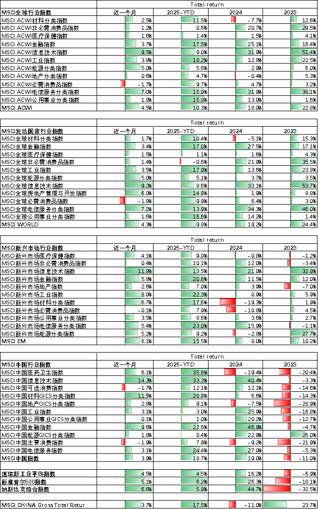 数据来源:BLOOMBERG,大成基金分行业看,全球股市除必需消费指数有下跌之外,其余各行业指数均有上涨。发达国家行业指数中信息技术,电信指数涨幅较大,分贝上涨9.5%和7.0%,仅有必需消费下跌1.7%。新兴市场国家中也是信息技术行业领涨,涨幅达到11.2%。MSCI中国指数中仅有可选消费指数下跌1,7%,信息技术材料涨幅最高,其中信息技术行业上涨超过14.3%。