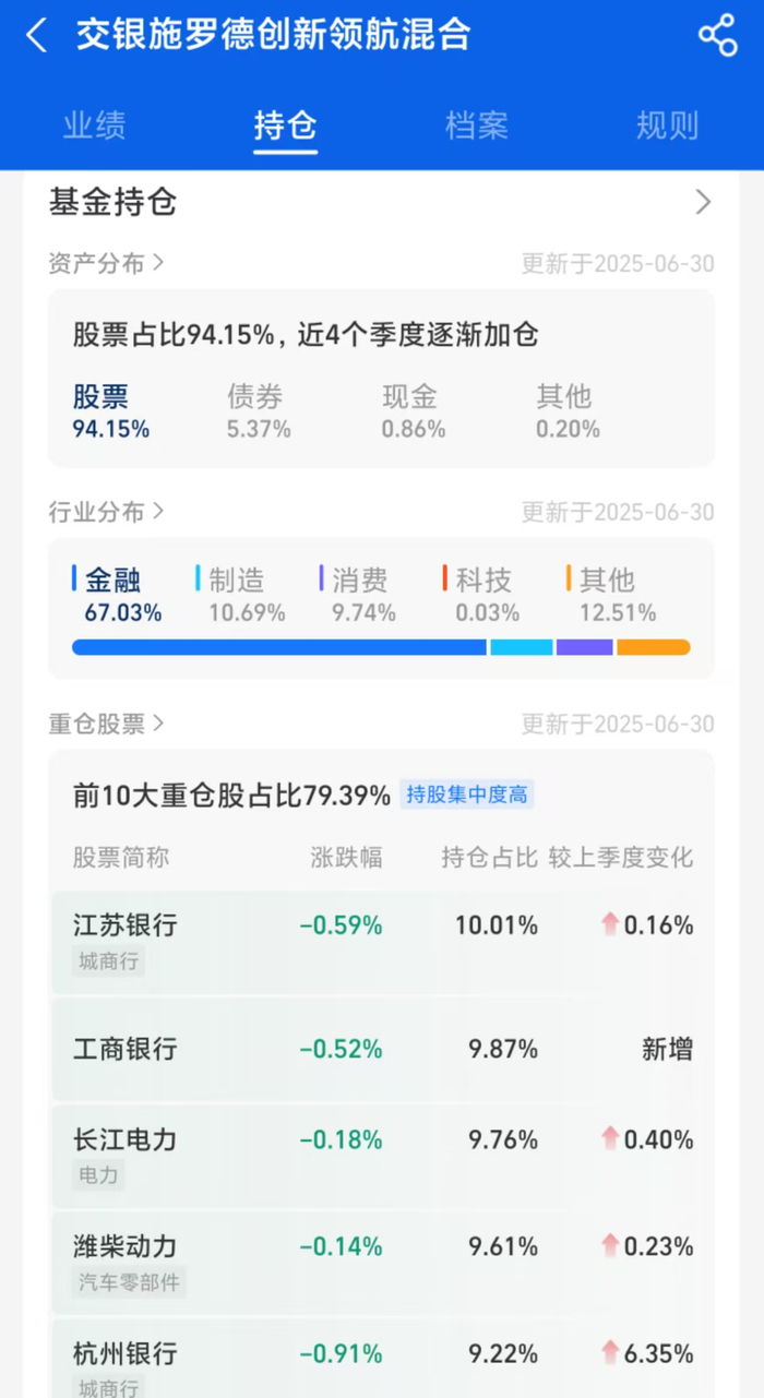 来源:蚂蚁财富作为聚焦科技创新的主题基金,交银创新领航混合2025年6月末的十大重仓股中,有7只为银行股。江苏银行为第一大重仓股,持仓占比达10.01%;工商银行H股为第二大重仓股,持股比例为9.87%。此外还有杭州银行、建设银行H股、中国银行H股以及农业银行A股和H股。7只重仓银行股合计持股占比50.85%。